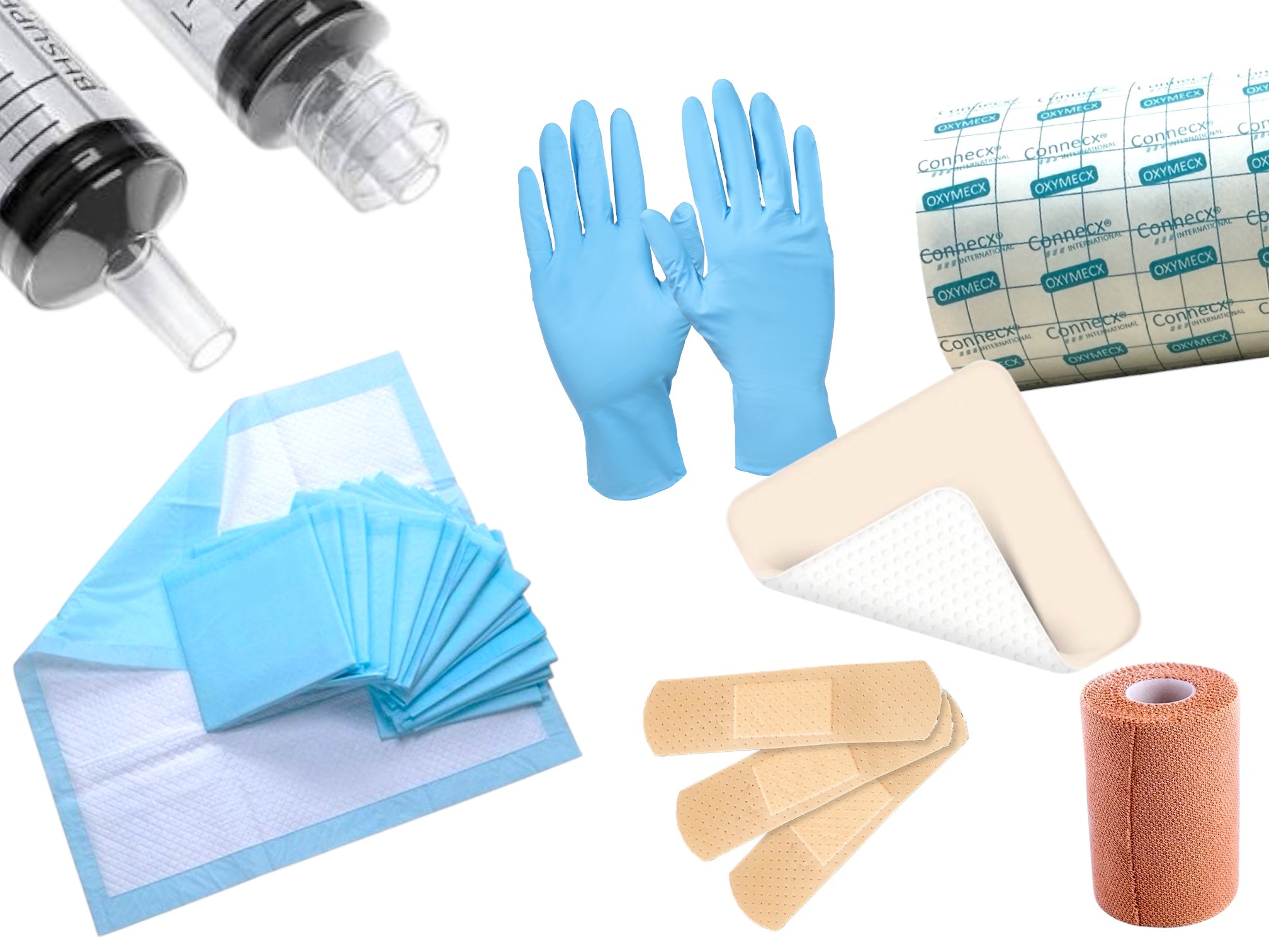 covering wound management, incontinence, home care healthcare supplies, personal hygiene, protective apparel, gloves, diagnostic tools, IV access, syringe and needle, bandages, and plaster